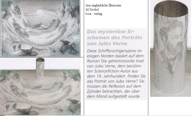 Zitat aus den Magischen Werken ... So werden hohle, wie auch säulenförmige Spiegel verfertigt, welche in einer gewissen Enfernung die Bilder der Gegenstände in der Luft gleich Schattengestalten erscheinen lassen. Anleitung zur Verfertigung solcher Spiegel geben Apollonius und Vitellius in ihren Schriften von der Perspektive und den Spiegeln.
