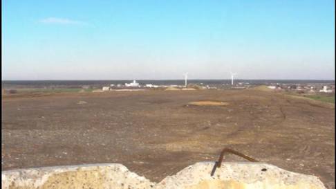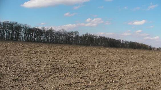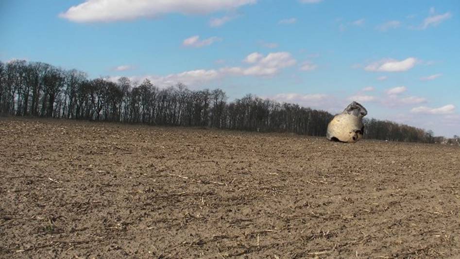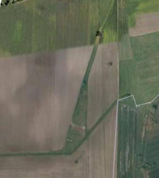 Hier habe ich die Stelle auf dem Foto markiert, wo solch ein rundlicher Brennofen nach Aussage der Zeichnung, die ich ebenfalls in diesem Bereich gefunden habe, gestanden hat. Dazu passt auch, dass sich dort sehr viele dunkelgraue Tonscherben, deutlich erhitzte Steine und nach Aussage der Bauern ein Friedhof vermutet wird. Hier passt, dass von der Straße (die 109 von Berlin nach Stralsund) durch diesen kurzen waldartigen Streifen vier breite Eingänge auf dieses schmale Feld führten.