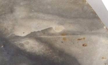 Hier sehen Sie eine Fotografie dieses Fundplatzes und daneben nahezu der gleiche Landschaftsausschnitt mit einem stark rauchenden Brennofen und ein großes zartes graues Gesicht im Profil, das mit geöffnetem Mund das schwarze Gesicht des Rauches berührt. Diese Deutlichkeit und dokumentarische Treue eines Steinbildes ist ausgesprochen selten.