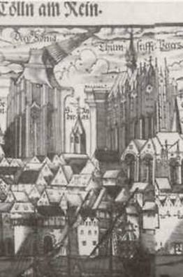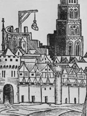 Hier noch einmal die ineinander verschachtelten Landschaftsbilder traditioneller Turmarchitektur. Daneben die mittelalterliche Darstellung eines Baukrans. Allerdings ohne Kugel und Kreuz...