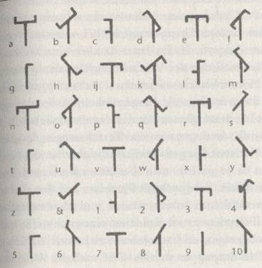 Semaphorenalphabet - typisch ist der winklige Aufbau
